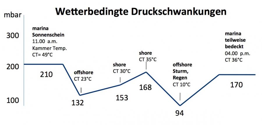 Kammerdruckschwankungen während der Fahrt sind gravierender als allgemein bekannt ist (s. Kurve unten).